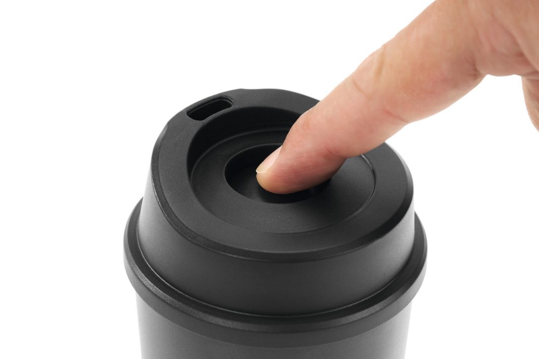 Schwarze Coffee-to-go-Cup mit aufgedruckten Äxten und dem STIHL TIMBERSPORTS® Logo. Dieser hochwertige Becher besteht aus robustem Edelstahl und hält den Kaffee lange warm. Ein praktischer Deckel mit Schraubverschluss verhindert, dass das Getränk ungewollt ausläuft. Die Trinköffnung kann mit einem Druckverschluss geschlossen werden. Höhe: 160 mm, Durchnmesser 90 mm, Fassungsvemögen: 380 ml, nicht spülmaschinen- und mirkowellengeeignet.